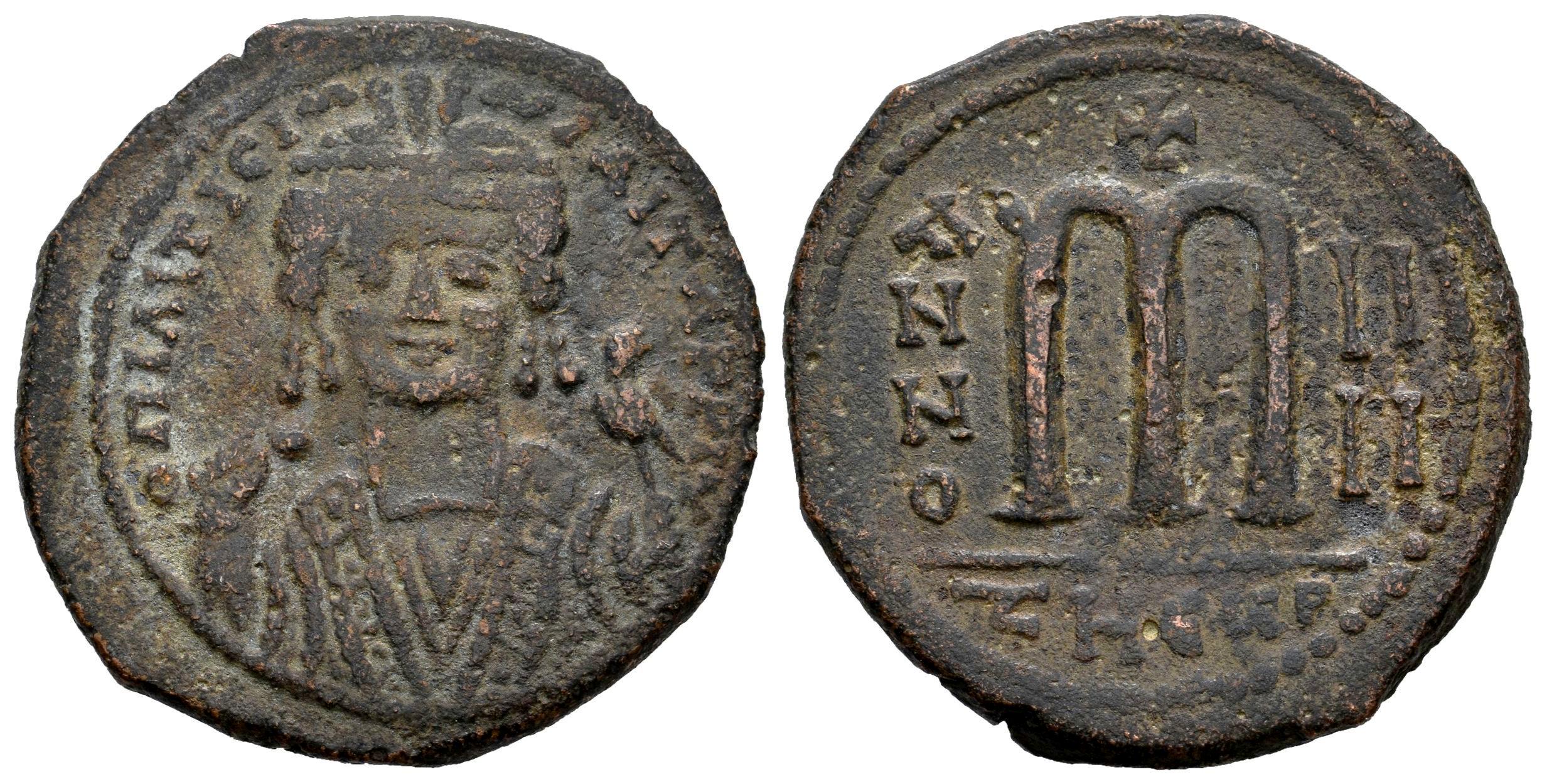 Mauricio Tiberio. 40 Nummi. RY 4 = 585/6 d.C. Theoupolis (Antioquía). (Doc-155). (MIB-95). (Sear-532). Anv.: ΠTINΟC S S TNTAPPIV. Busto coronado de Mauricio Tiberio de frente, con hábito consular, sosteniendo un mapa en la mano derecha y un cetro con punta de águila en la izquierda. Rev.: A/N/N/O - II/II / THEUP' M grande; arriba, cruz. Ae. 11,08 g. MBC. Est...50,00.