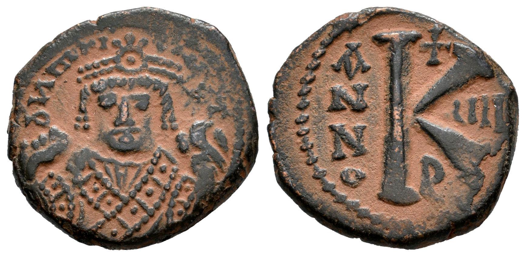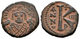 Mauricio Tiberio. 20 Nummi. RY 4 = 585/6 d.C. Theoupolis (Antioquía). (Doc-49). Anv.: Busto coronado de Mauricio Tiberio, con corona rematada con trébol y manto consular, sosteniendo un mapa y un cetro con punta de águila. Rev.: K grande entre A/N/N/O y IIII; arriba, cruz; abajo, R. Ae. 5,52 g. Pátina artificial. MBC+. Est...30,00.