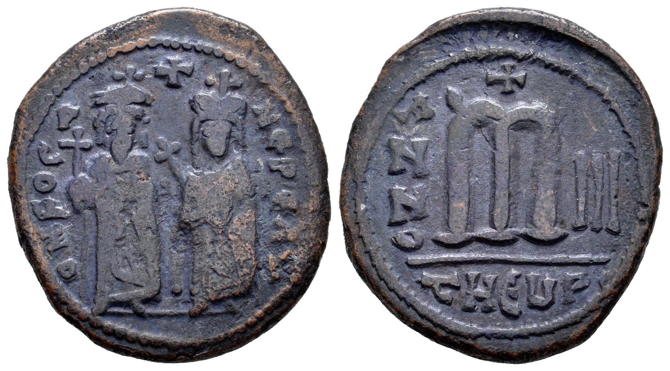 Phocas. 40 Nummi. RY 3 = 604/5 d.C. Theoupolis (Antioquía). (Doc-85). (Sear-671). Anv.: O N FOCA NEPE AV. Phocas y Leoncia en pie, uno frente al otro, sosteniendo un globo cruciforme y un cetro cruciforme, respectivamente; cruz entre ellos. Rev.: M grande; cruz arriba, ANNO hacia abajo en el campo izquierdo, III en el campo derecho, THEЧP' en exergo. Ae. 10,20 g. MBC-/MBC. Est...40,00.