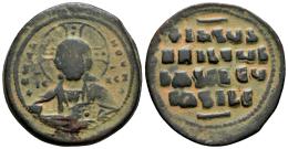 Anónimo. Tiempos de Basil II y Constantino VIII. 40 Nummi. 976-1065 d.C. Constantinopla. (Sear-1813 var.). Anv.: + ЄMMA NOVHΛ. Busto de Cristo Pantokrator de frente; IC-XC en los campos. Rev.: + IҺSЧS XRISTЧS ЬASILЄЧ ЬASILЄ en cuatro líneas, adornos arriba y abajo; todo dentro de un borde circular punteado. Ae. 14,34 g. MBC-/MBC. Est...30,00.