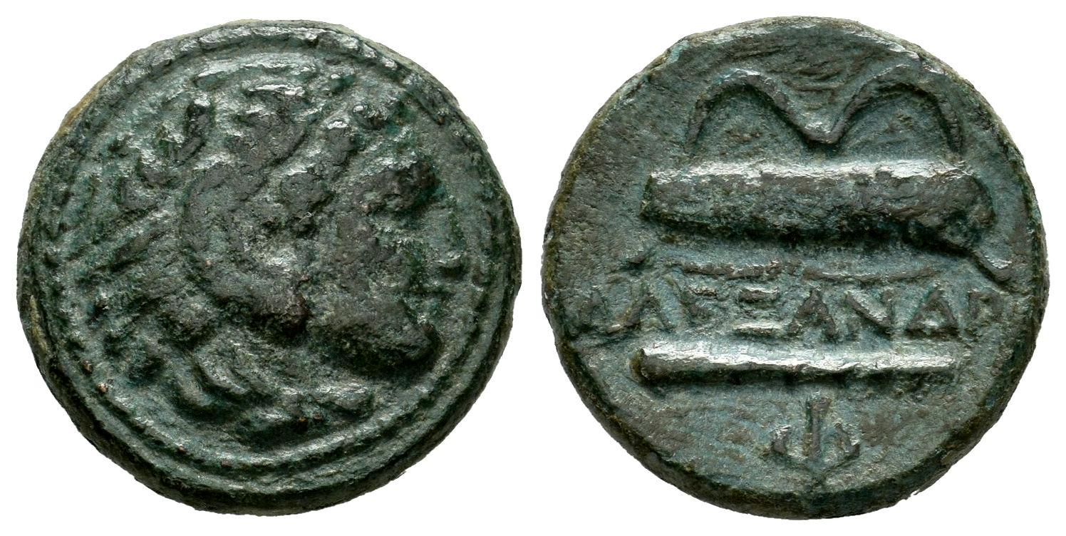 Reino de Macedonia. Alejandro III Magno. AE 18. 336-323 a.C. Ceca incierta en Macedonia. (Price-313). Anv.: Cabeza de Heracles a la derecha, con piel de león. Rev.: AΛEΞANΔPOY. Maza y arco en carcaj; Φ abajo. Ae. 5,02 g. MBC-/MBC. Est...50,00.