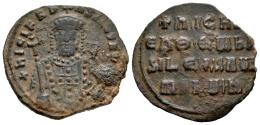 Nicephorus II Phocas. Nummus. 963-696 d.C. Constantinopla. (Doc-7). (Sear-1783). Anv.: nICIFR bASILЄV RѠ. Busto coronado de frente, con loros, sosteniendo un cetro cruciforme y un globo rematado por un trébol. Rev.: + ҺICHF ЄN ΘЄѠ bASILЄVS RѠmAIѠҺ en cuatro líneas. Ae. 5,16 g. MBC. Est...40,00.