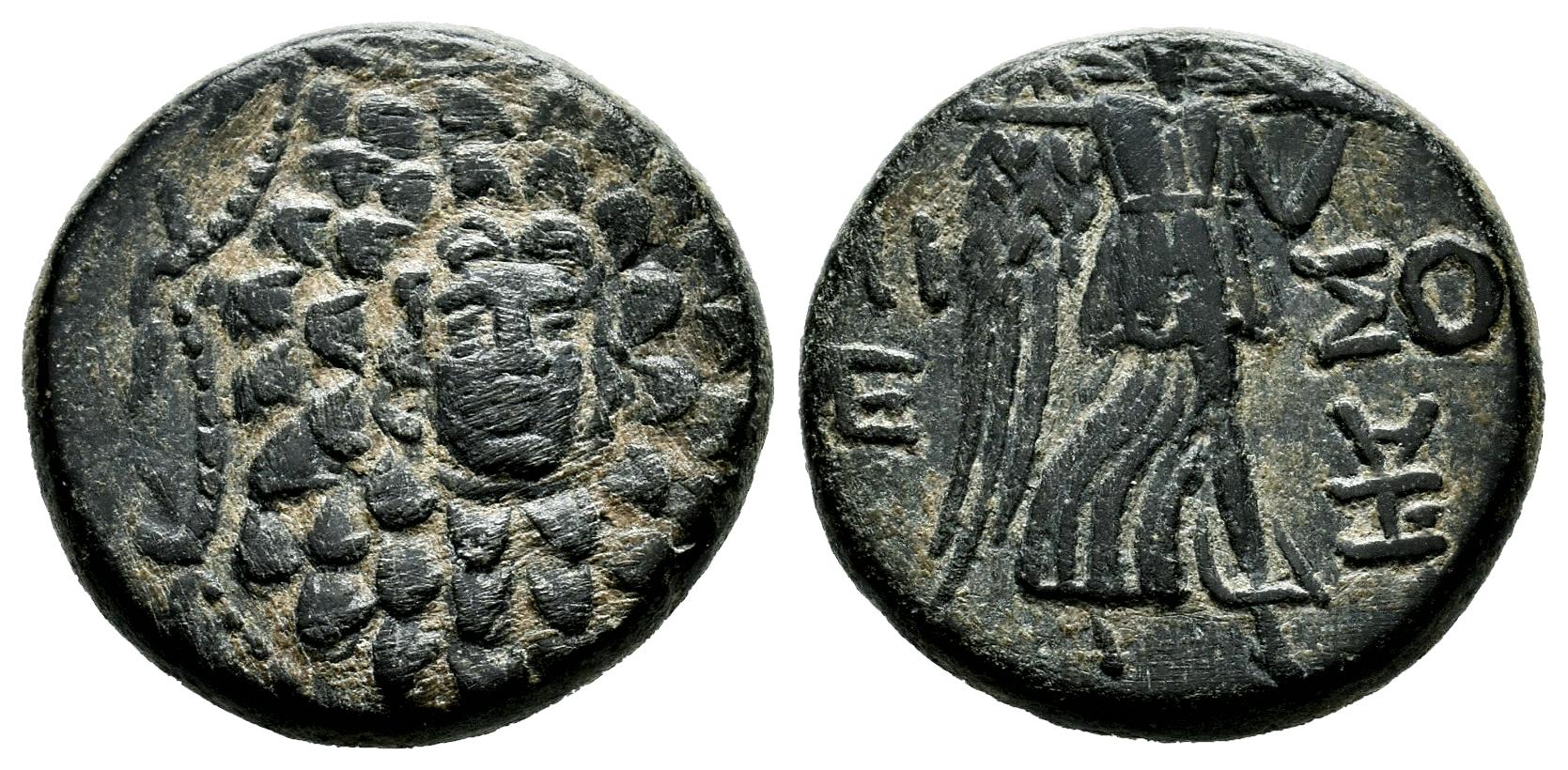 Pontos. Amisos. AE 20. 111-105 o 95-90 a.C. Tiempos de Mithradates VI Eupator. (SNG Stancomb-688). (SNG BM Black Sea-1189). (Hgc-7, 242). Anv.: Aegis, con gorgoneion de frente en el centro. Rev.: Nike avanzando a la derecha, sosteniendo una palma sobre el hombro; (A)MI-ΣO(Y) a los lados, monogramas en los campos inferiores izquierdo y derecho. Ae. 7,58 g. MBC/MBC+. Est...50,00.
