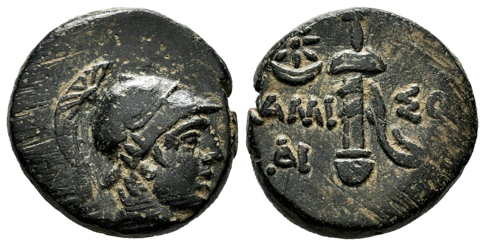 Pontos. Amisos. AE 20. 120-63 a.C. Tiempos de Mithradates VI . (Sng Cop-150). Anv.: Cabeza de Ares a la derecha. Rev.: ΑΜΙ-ΣΟ(Υ). Espada en vaina; monogramas a la izquierda y a la derecha. Ae. 7,22 g. MBC-/MBC. Est...50,00.