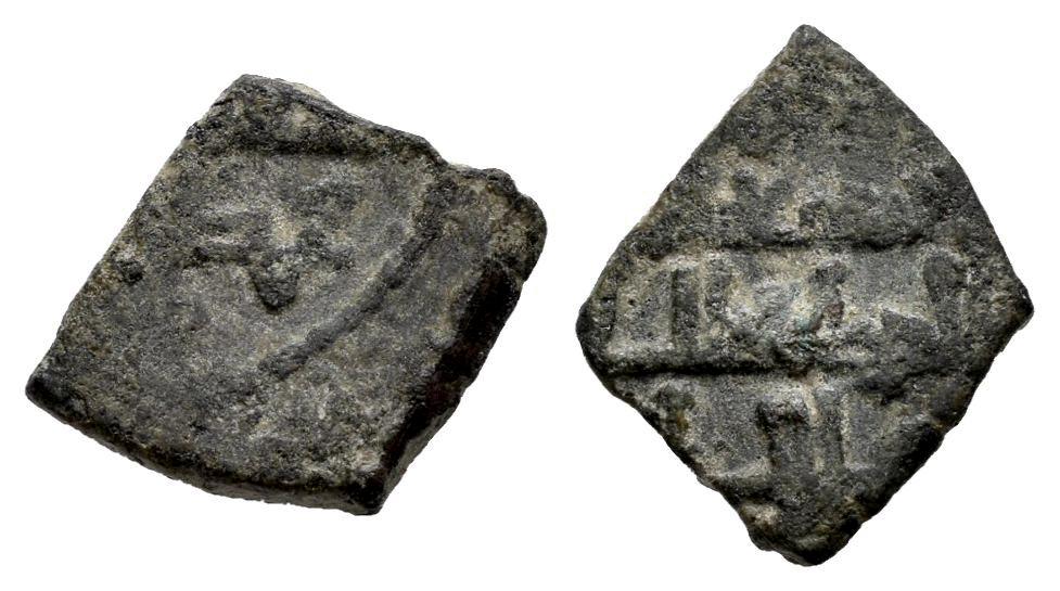 Reinos de Taifas. Umar Al-Mutawakil. Fracción de Dirham. 450-487 H. Taifa de Badajoz. (Vives-1002/6). (Vives & Prieto-377). Ae. 0,75 g. La moneda Handusí nº 48, mismo ejemplar. Escasa. BC-/BC+. Est...50,00.