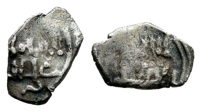 Reinos de Taifas. Umar Al-Mutawakil. Fracción de Dirham. 450-487 H. Taifa de Badajoz. (Vives-1021). (Prieto-393 var.). (Fbm-X3). Ag. 0,23 g. Muy escasa. BC+/BC-. Est...60,00.