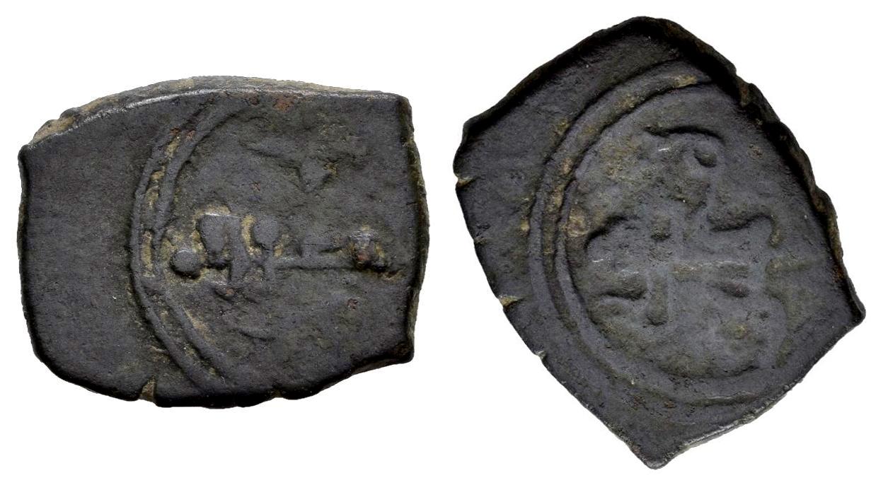 Reinos de Taifas. Umar Al-Mutawakil. Fracción de Dirham. 463-487 H. Taifa de Badajoz. (Manquso-No. 2,59-60). Ae. 1,75 g. Rara. BC+. Est...30,00.