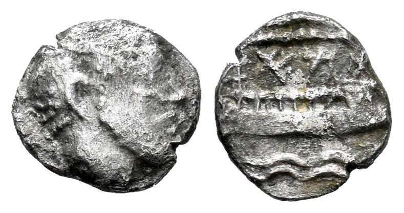 Siria. Arados. Óbolo. 380-350 a.C. (Hgc-10/46). Anv.: Cabeza laureada de Baal. Rev.: Galera a derecha. Ag. 0,58 g. BC+/MBC-. Est...30,00.