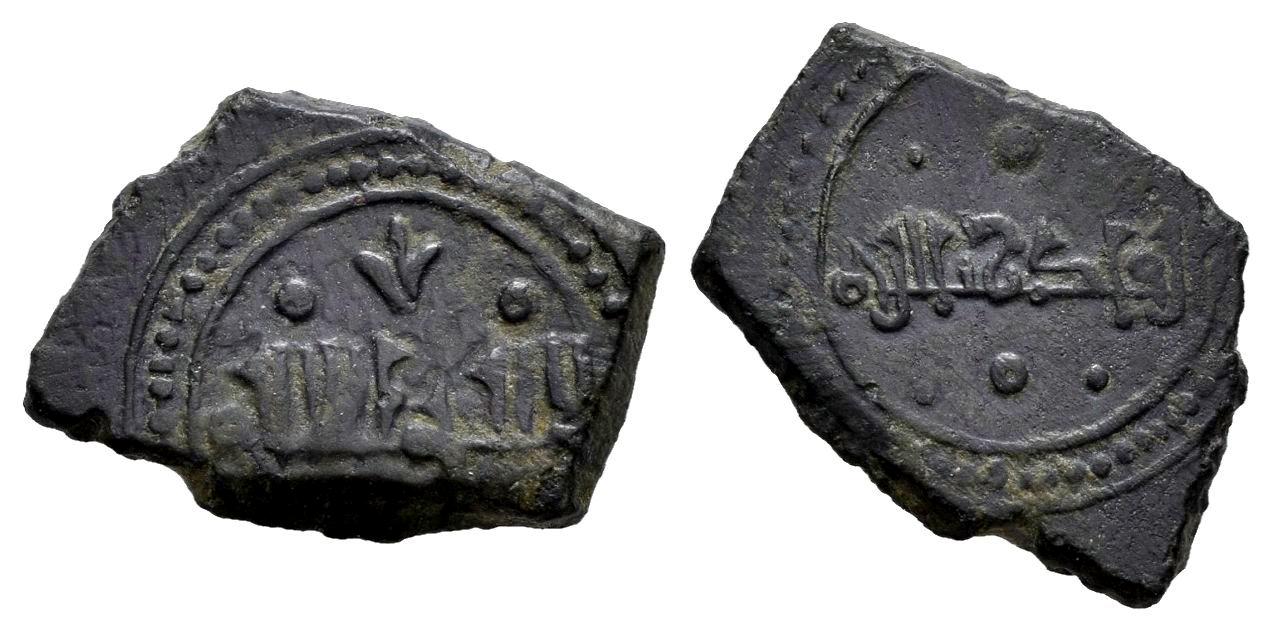 Reinos de Taifas. Yahya II Al-Qadir. Fracción de Dirham. 472-478 H. Taifa de Toledo. (J. José Ríos-No cita). (Vives-No cita). Ve. 1,57 g. Tipo aparentemente inédito que combina el anverso con leyenda tipo 5k (Segunda línea no visible) y el reverso con leyenda 3r. J. José Ríos no cita esta distribución. Muy rara. MBC/MBC+. Est...80,00.