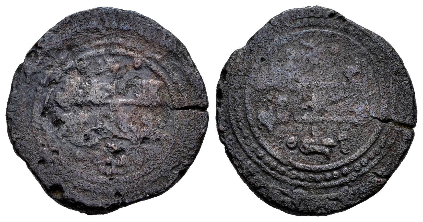 Reinos de Taifas. Yahya II Al-Qadir. Fracción de Dirham. 474-477 H. Madinat Kunka (Cuenca). Taifa de Toledo. (Vives-1121). (Prieto-343b). Ve. 3,88 g. BC-/BC. Est...30,00.