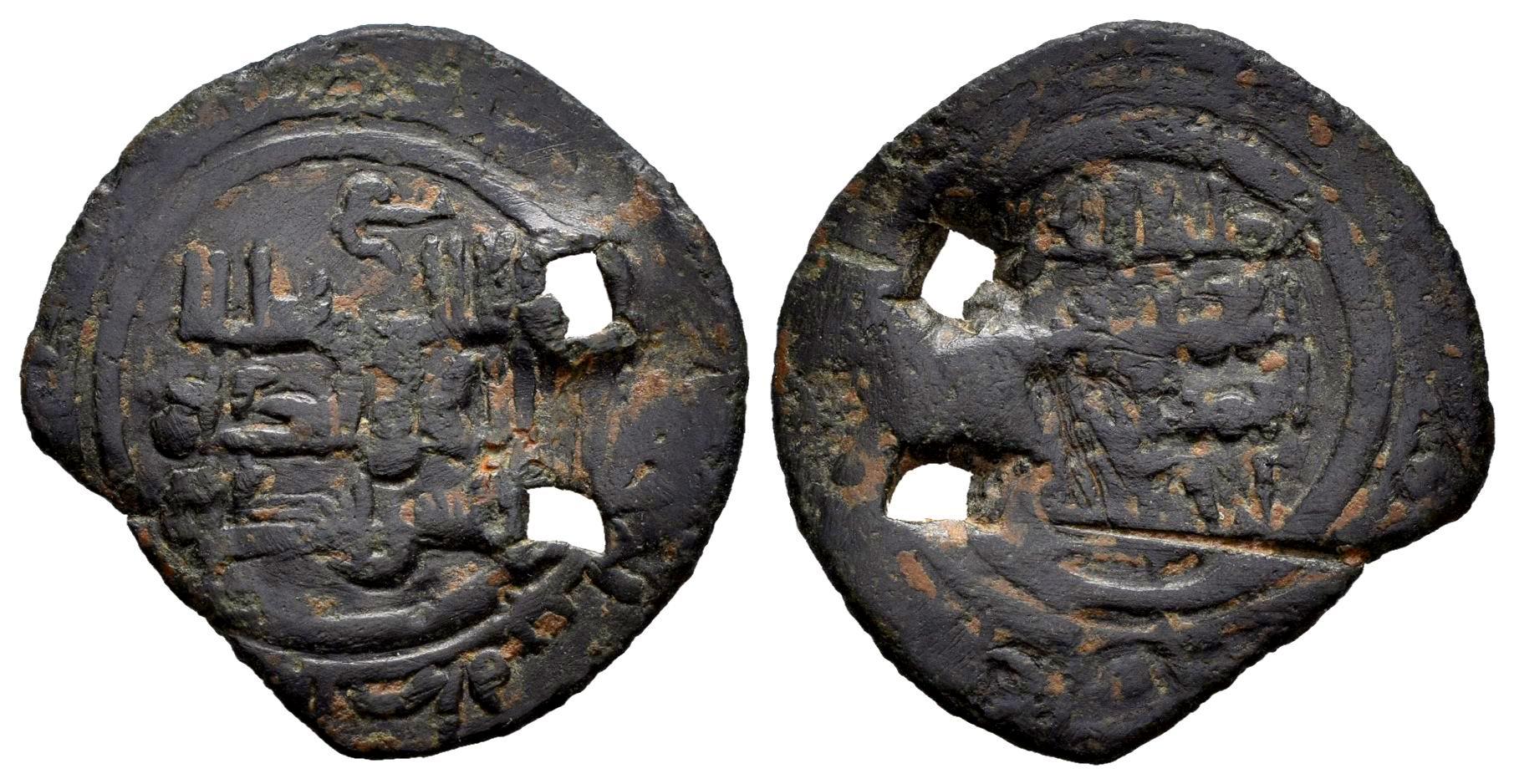 Reinos de Taifas. 'Imad al-Dawla Ahmad I ibn Sulayman, al-Muqtadir . Dirham. 441-475 H. Saraqusta (Zaragoza). Taifa de Zaragoza. Ve. 2,32 g. Cospel faltado y dos perforaciones. BC+. Est...50,00.