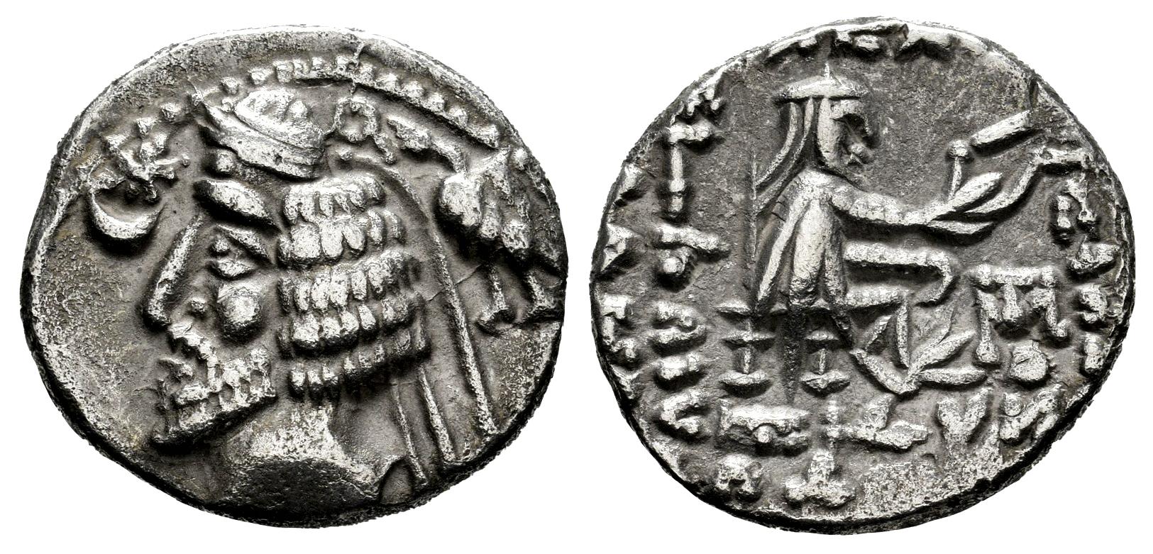 Imperio Parto. Phraates IV. Dracma. 38-2 a.C. Mithradatkart. (Sellwood-54.8). (Shore-299). (Sunrise-396). Anv.: Busto con diadema y drapeado a la izquierda, verruga en la frente, con barba puntiaguda y collar segmentado; estrella en creciente a la izquierda; a la derecha, águila a la izquierda, sosteniendo corona; todo dentro de un borde de puntos. Rev.: Arquero (Arsakes I) sentado a la derecha sobre trono, sosteniendo un arco; monograma debajo del arco. Ag. 3,85 g. MBC+/MBC. Est...100,00.