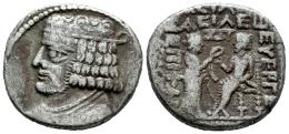 Imperio Parto. Vardanes II. Tetradracma. SE 366, Peritios = Enero, 56 d.C. Seleukeia en el Tigris. (Sellwood-69.3). (Shore-382 var.). Anv.: Busto diademado y drapeado a la izquierda. Rev.: ΒΑΣΙΛΕΩΣ / ΒΑΣΙΛΕΩΝ - ΑΡΣΑΚΟY / ΕYΕΡΓΕΤΟY - ΔΙΚΑΙΟY - ΕΠΙΦΑΝΟYΣ / ΦΙΛΕΛΛΗΝ ΟΣ. Vologases I sedente a la izquierda, recibiendo la corona de Tyche, en pie a la derecha, sosteniendo cetro; en el campo, ΖΞΤ (fecha); en exergo, (ΠΕΡΙΤΙΟΥ). Ag. 13,35 g. MBC/MBC-. Est...180,00.