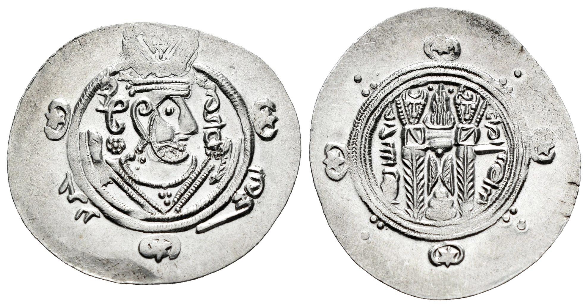 Califato Abásida. Sulayman bin Musa'. Hemidracma. PYE 135 = 170 H. Tabaristán. (Album-64). Anv.: Busto drapeado estilo sasánida a la derecha, con una elaborada corona; detrás y delante de la cabeza, 'GDE - ʾp̄zwt' ('[que su gloria] aumente' en Pahlavi); en el margen exterior izquierdo, 'Jarīr' ('Jarir' en árabe); en el margen exterior derecho, 'ʾp̄d' ('maravilloso' en pahlavi). Rev.: Altar del Fuego, flanqueado por dos asistentes; sobre el altar, dos estrellas; a la izquierda fecha en Pahlavi; a la derecha 'tpwlstʾn' ('Tabaristán' en Pahlavi). Ag. 1,92 g. Restos de brillo original. Rara. EBC/EBC+. Est...80,00.