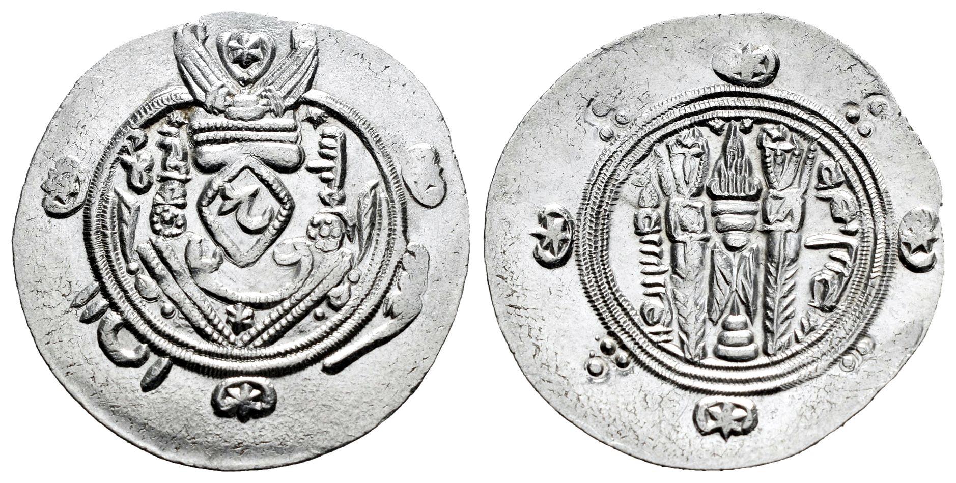 Califato Abásida. Sulayman bin Musa'. Hemidracma. PYE 137 = 172 H. Tabaristán. (Album-65). (Walker-Arab-Sasanian 287). (Malek-105.1). Anv.: Palabra coronada y cubierta 'bakh' ('bueno' en cúfico) dentro de un diamante; detrás de la cabeza, AFZUT GDH ('que su realeza aumente' en Pahlawi); antes del encabezado, 'Sulayman' en cúfico; en el margen exterior, APD/NWKW ('excelente' y 'bueno' en pahlawi). Rev.: Altar del fuego sasánida colocado sobre tres escalones, flanqueado por dos asistentes enfrentados; a la izquierda, fecha; a la derecha, nuevo TPURSTAN ('Tabaristán' en Pahlawi). Ag. 2,07 g. Var. Estrella en el pecho. Restos de brillo original. EBC+/SC-. Est...80,00.