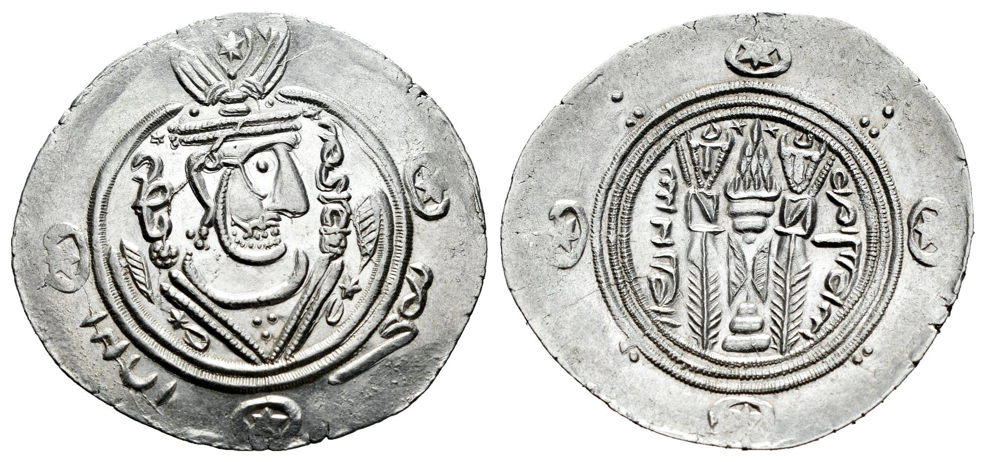 Califato Abásida. Tipo AFZWT, tiempos de Al-Rashid. Hemidracma. PYE 133 = 168 H. Tabaristán. (Album-73). (Walker-Arab-Sassanian, 306). (SICA-I 423). Anv.: Busto drapeado estilo sasánida a la derecha, con una elaborada corona; detrás y delante de la cabeza, 'GDE - ʾp̄zwt' ('[que su gloria] aumente' en Pahlavi); en el margen exterior izquierdo, 'Jarīr' ('Jarir' en árabe); en el margen exterior derecho, 'ʾp̄d' ('maravilloso' en pahlavi). Rev.: Altar del Fuego, flanqueado por dos asistentes; sobre el altar, dos estrellas; a la izquierda fecha en Pahlavi; a la derecha 'tpwlstʾn' ('Tabaristán' en Pahlavi). Ag. 2,10 g. Var. ·.· en el pecho. EBC+. Est...60,00.