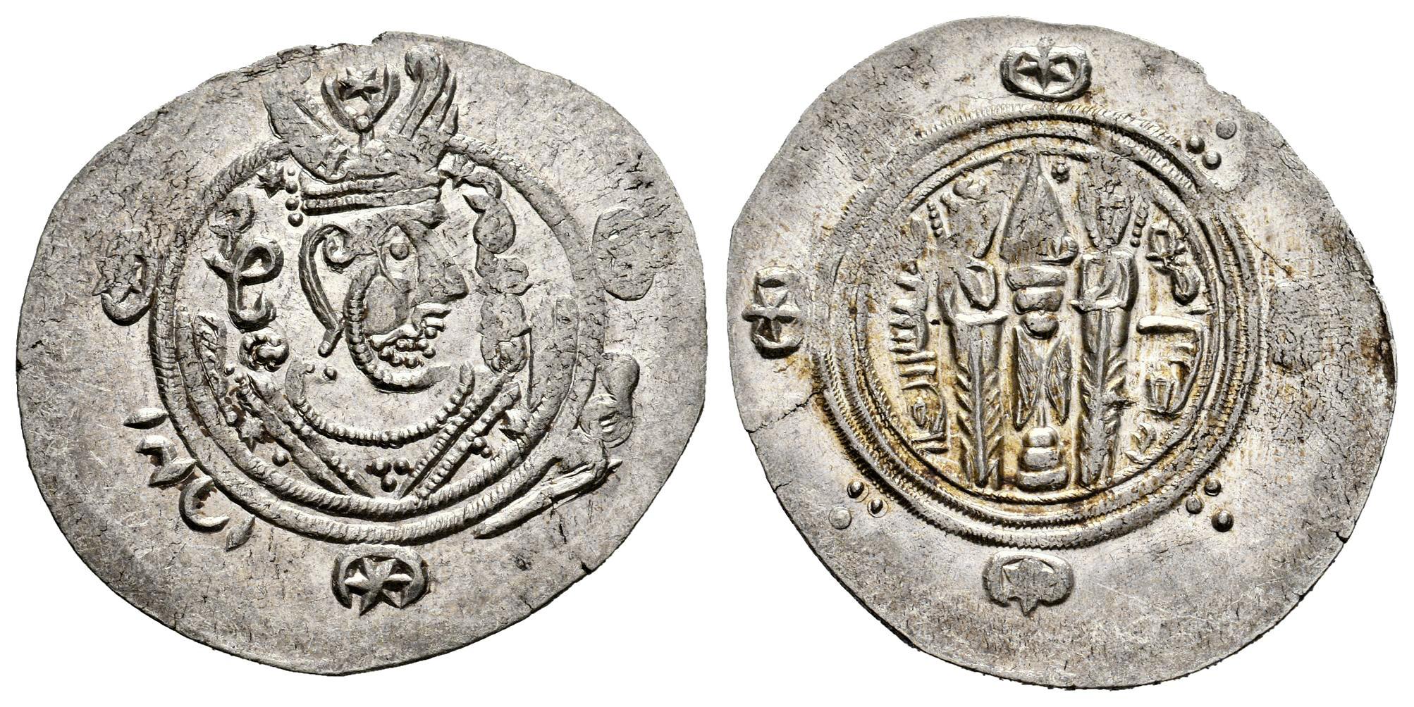 Califato Abásida. Tiempos de Al-Rashid. Hemidracma. PYE 136 = 171 H. Tabaristán. (Album-73a). Anv.: Busto de estilo sasánida cubierto a la derecha, con una elaborada corona; detrás y delante de la cabeza, “GDE ˗ ʾp̄zwt” (“[que su] gloria aumente” en pahlavi); en el margen exterior a izquierda y derecha, “nywk' ˗ ʾp̄d” (“bueno ˗ maravilloso” en pahlavi). Rev.: Altar encendido, flanqueado por dos asistentes; sobre el altar, estrella y perdigón; a la izquierda, fecha en pahlavi; a la derecha, “tpwlstʾn” (“Tabaristán” en pahlavi). Ag. 1,65 g. Restos de brillo original. Variante con tres puntos ·.· en el pecho. EBC/EBC+. Est...50,00.