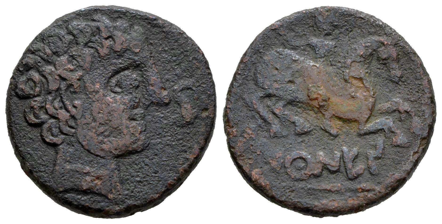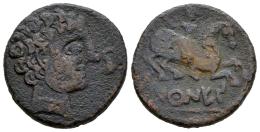 Baskunes-Barskunes. As. 120-20 a.C. Pamplona. (Abh-225). (MIB-87/04c). Anv.: Cabeza barbada a derecha, delánte delfín esquemático hacia abajo. Rev.: Jinete con espada a derecha, leyenda sobre línea y ligeramente curva BARSKUNES debajo. Ae. 8,17 g. Muy escasa. MBC-/BC+. Est...150,00.