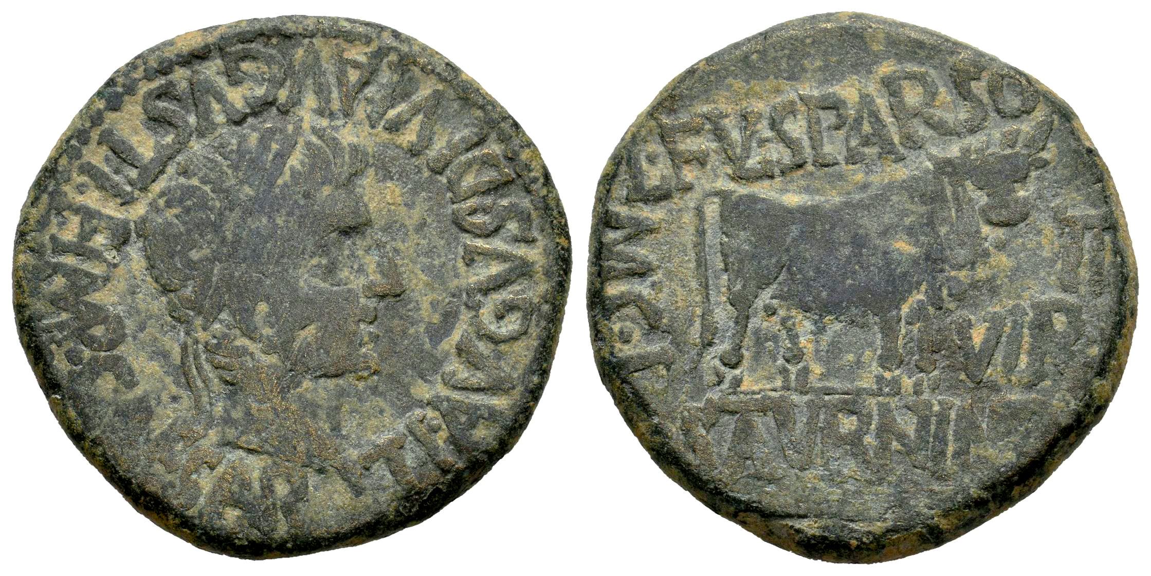 Calagurris. Época de Tiberio. As. 14-36 a.C. Calahorra (La Rioja). (Abh-429). (Acip-3128). Anv.: Cabeza laureada de Tiberio a derecha, alrededor TI. AVGVS. DIVI. AVGVSTLF. IMP. CAESAR. Rev.: Toro a derecha, alrededor L. FVL. SPARSO. L. SATVRNINO. II. VIR. M. C. I. Ae. 12,03 g. MBC-. Est...65,00.