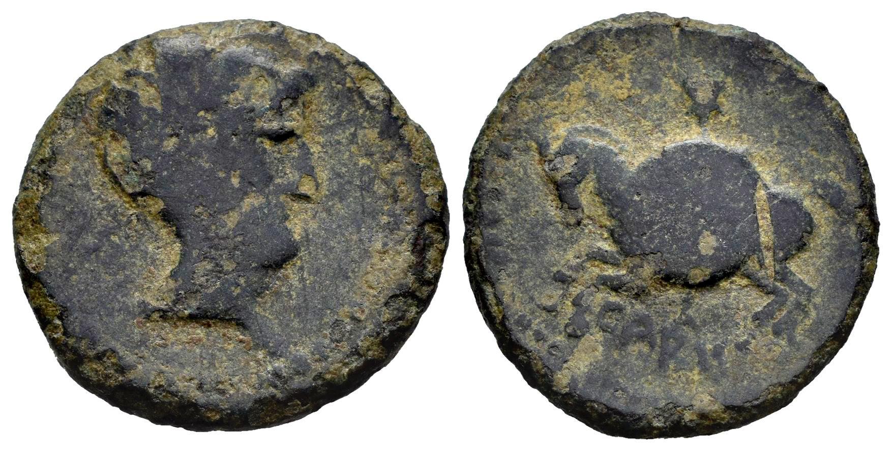 Carisa. Semis. 50 a.C. Bornos (Cádiz). (Abh-447). (Acip-2513). Anv.: Cabeza masculina laureada a derecha. Rev.: Jinete con lanza y rodela a izquierda, debajo leyenda CARIS. Ae. 4,92 g. BC. Est...30,00.