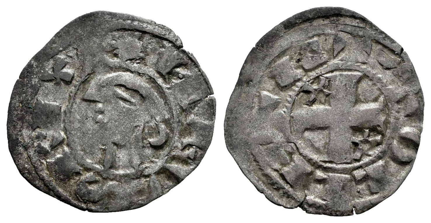 Reino de Castilla y León. Alfonso I (1109-1126). Dinero. Toledo. (Bautista-40.6). Anv.: ANFVS REX. Rev.:  + (Creciente) TOLLETA. Ve. 0,71 g. Estrella en 1º y 4º cuartel. MBC-. Est...25,00.