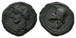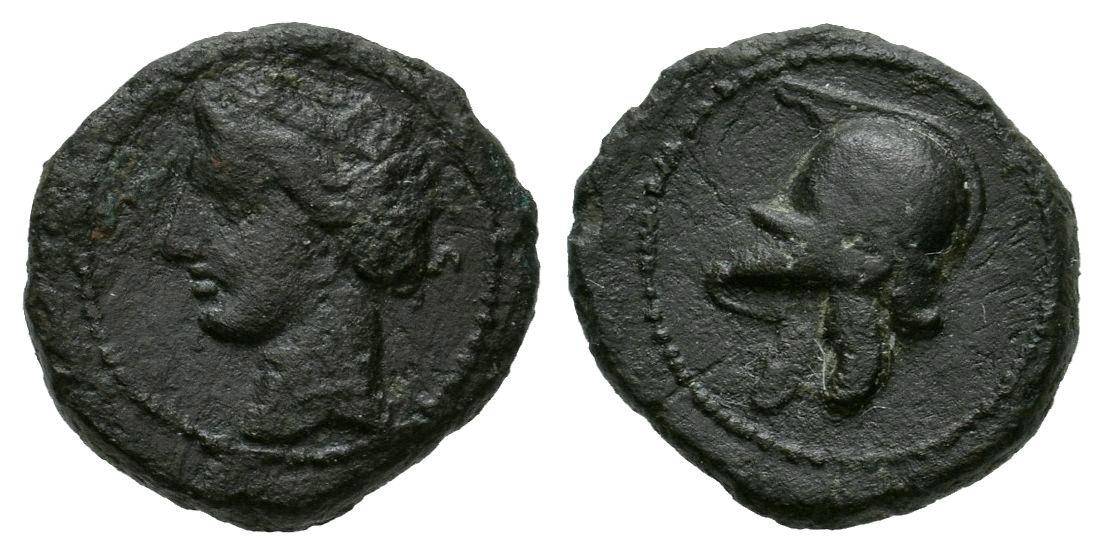 Acuñaciones Hispano-Cartaginesas. 1/4 calco. 220-215 a.C. Cartagena (Murcia). (Abh-521). (Acip-582). Anv.: Cabeza de Tanit a derecha. Rev.: Casco. Ae. 1,64 g. Pátina negra artificial. MBC-/MBC. Est...50,00.