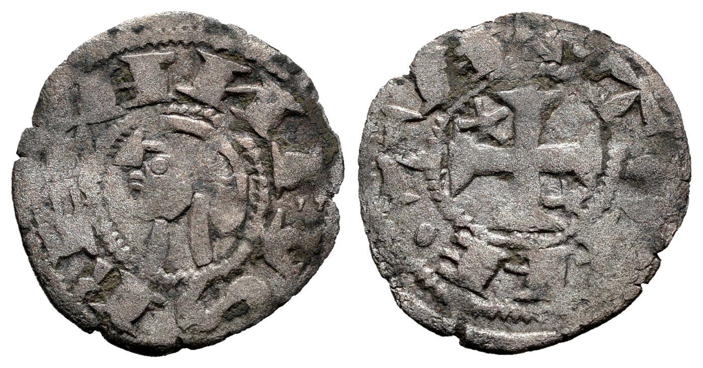 Reino de Castilla y León. Alfonso I (1109-1126). Dinero. Toledo. (Bautista-40.9). Anv.: AИFVS REX. Rev.: + ⠁TOLLE⠁TA. Ve. 0,82 g. Estrella en 1º y 4º cuartel. MBC-. Est...25,00.