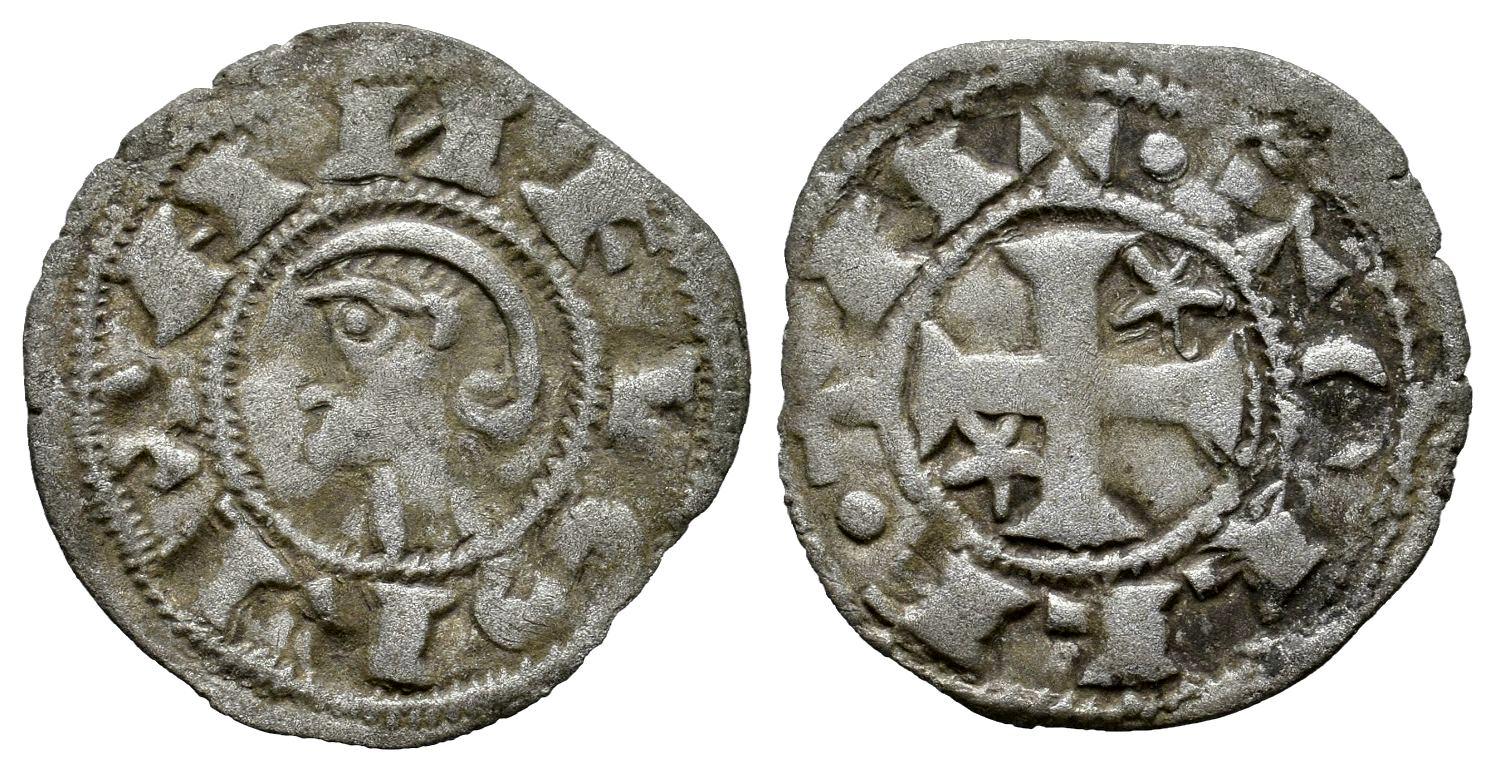 Reino de Castilla y León. Alfonso I (1109-1126). Dinero. Toledo. (Bautista-40.09 var.). Anv.: AИFVS REX. Rev.: + · TOLLE · TA. Estrellas en el 2º y 3º cuartel. Ve. 0,73 g. Otros autores la atribuyen a Alfonso VIII. MBC. Est...40,00.