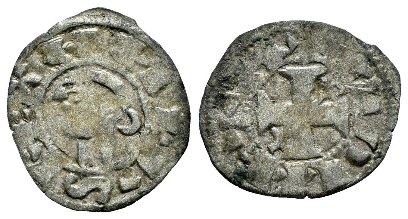 Reino de Castilla y León. Alfonso I (1109-1126). Dinero. Toledo. (Bautista-40.19). Anv.: AИFVS REX. Rev.: + (Creciente) TOLLETA. Ve. 0,73 g. Roel estrellado en 2º y 3º cuadrante. MBC-. Est...25,00.