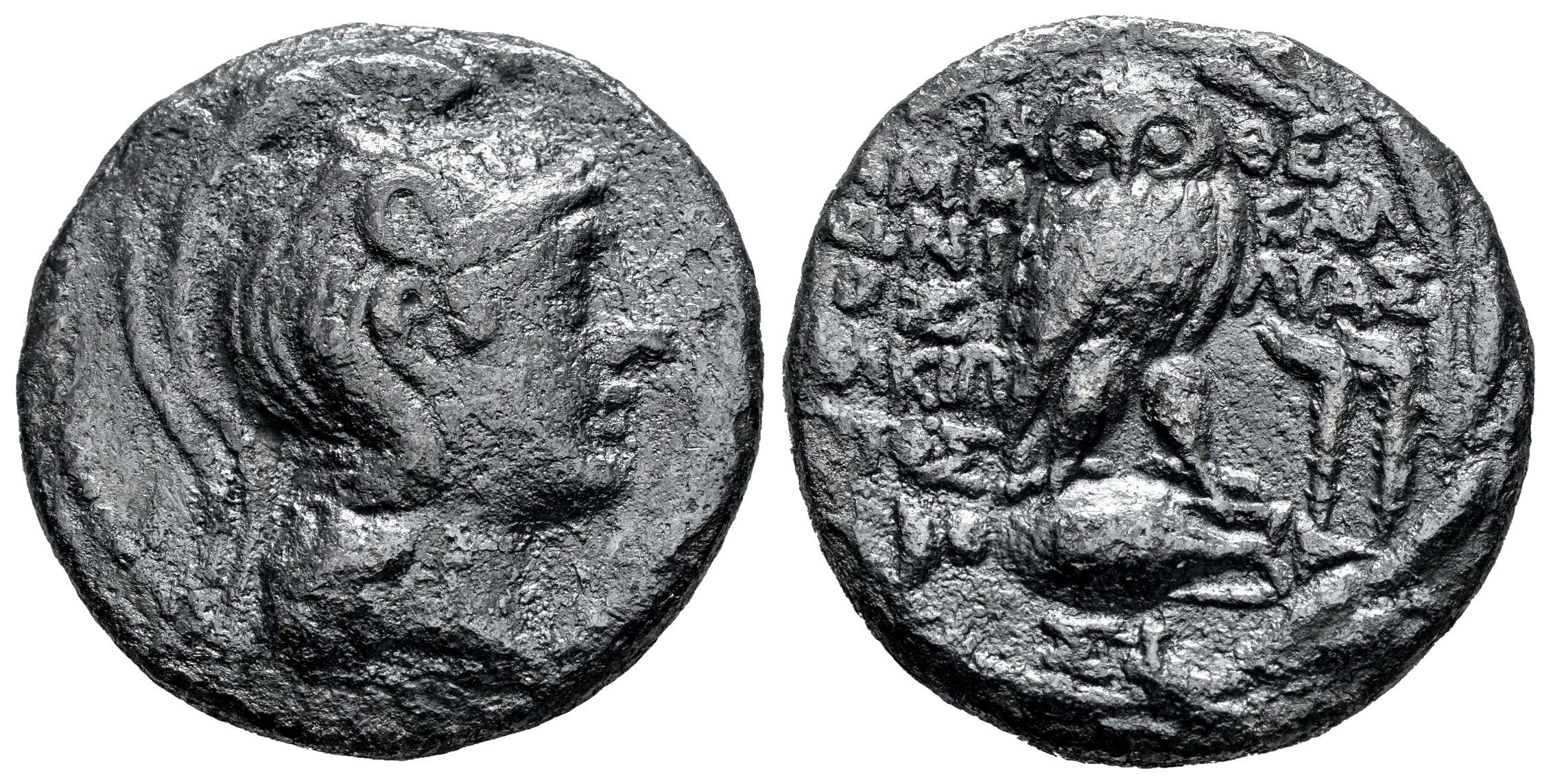 Attica. Atenas. Tetradracma de nuevo estilo. 150/49 a.C. Magistrados Ammonios, Kallias y Byttakos. (Thompson-593 var.). (Hgc-4, 1602 var.). Anv.: Cabeza de Atenea Parthenos a la derecha, con collar, pendiente colgante y casco ático de triple cresta decorado con los prótomos de cuatro caballos sobre la visera, un Pegaso en vuelo hacia la derecha sobre el auricular elevado y un adorno curvilíneo en el cuenco. Rev.: Búho en pie a la derecha, con la cabeza mirando de frente, sobre un ánfora con M (mes); A-ҨE encima de AMM-ΩNI-OΣ KAΛ-ΛIAΣ BYTTAKOΣ (nombres de los magistrados) en cinco líneas a lo ancho del campo, dos antorchas en el campo derecho, ΣΦ debajo; todo dentro de una corona. Ag. 14,87 g. Pátina oscura. Oxidaciones. MBC-. Est...150,00.