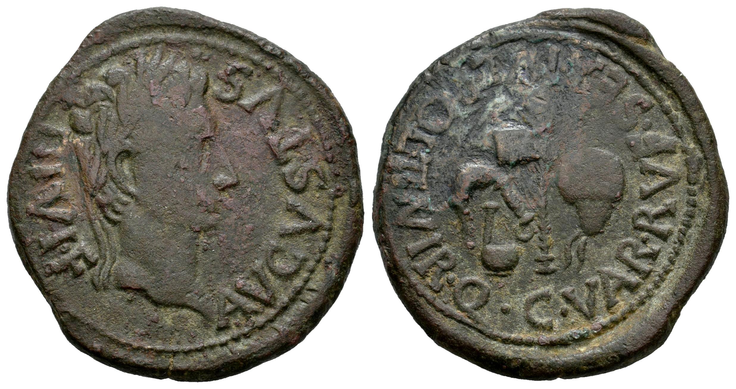 Cartagonova. Época de Augusto. As. 27 a.C-14 d.C. Cartagena (Murcia). (Abh-577). (Acip-3137). Anv.: Cabeza laureada de Augusto a derecha, alrededor leyenda AVGVSTVS. DIVI. F. Rev.: En el centro aspérgilo, símpulo, segur y apex, alrededor C. VAR. RVF. SEX IVL. POL. II. VIR. Q. Ae. 14,06 g. MBC. Est...100,00.