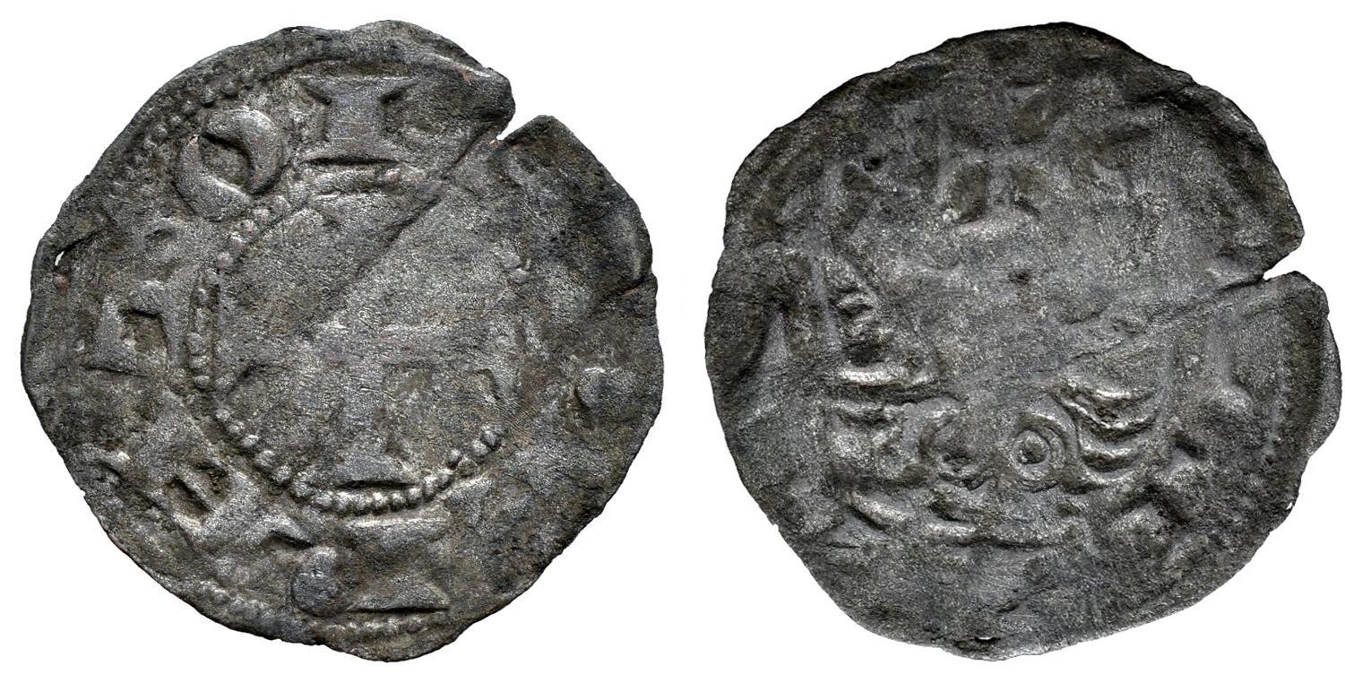 Reino de Castilla y León. Alfonso IX (1188-1230). Dinero. León. (Bautista-156.2). Anv.: INPERATOI. Ve. 0,73 g. L invertidas a los lados de la I sobre el león. Leve doblez. Muy rara. BC+. Est...200,00.