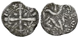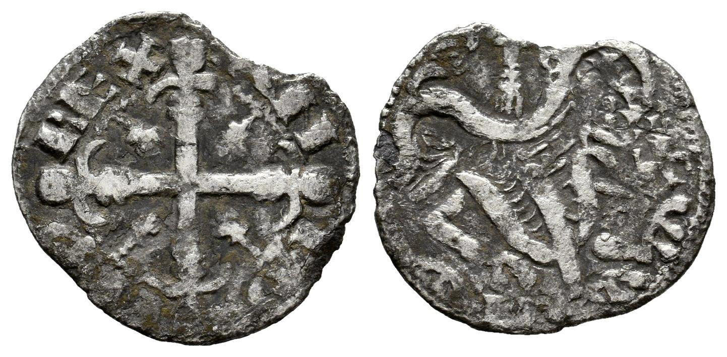 Reino de Castilla y León. Alfonso IX (1188-1230). Dinero. Santiago de Compostela. (Bautista-216.2). Ve. 0,87 g. Cruz y venera sobre el león, S-I entrecruzadas delante del león. Cospel levemente faltado. Escasa. MBC-. Est...60,00.