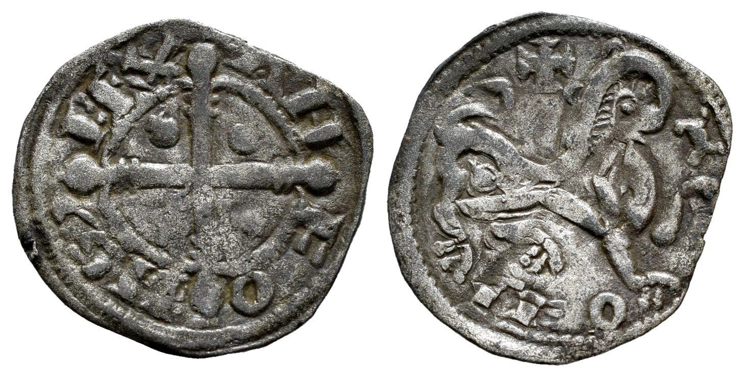 Reino de Castilla y León. Alfonso IX (1188-1230). Dinero. Santiago de Compostela. (Bautista-220.2). (Imperatrix-A9:5.26, mismo ejemplar). Ve. 0,69 g. Cruz y venera sobre el león, S-I degenerada delante del león. La L de LEO está invertida. Creciente sobre vástago en el 3º cuartel. Muy rara. Ex colección Hernández-Canut, Cayón 20/03/2020), lote 230; Imperatrix A9:5.26, mismo ejemplar. MBC. Est...250,00.