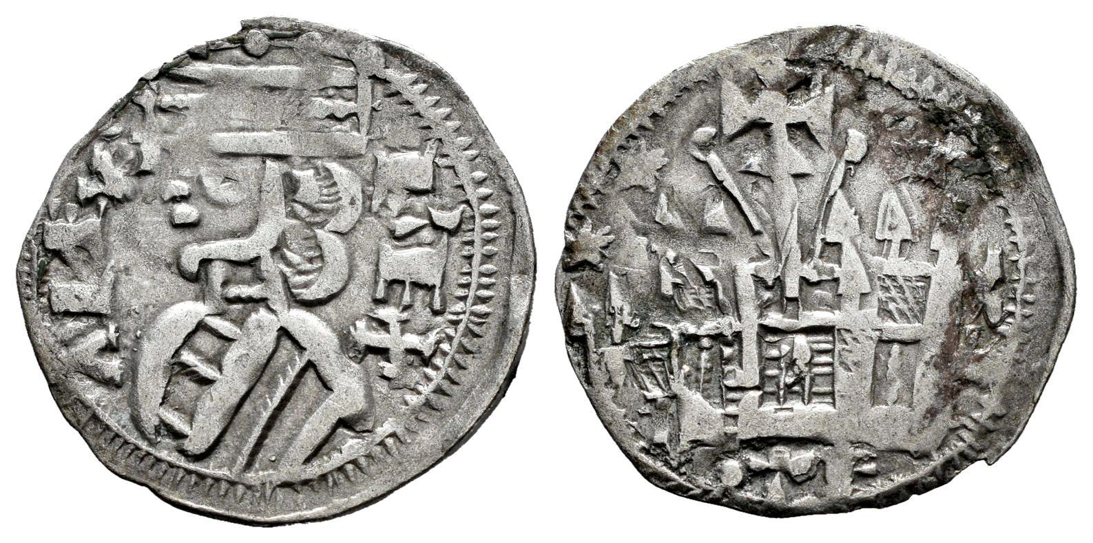 Reino de Castilla y León. Alfonso VIII (1158-1214). Dinero. (Bautista-312). Ve. 1,21 g. Estrellas sobre el castillo. Doble acuñación en reverso. MBC+/MBC. Est...60,00.