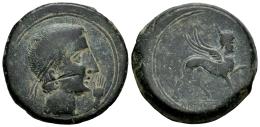 Kastilo-Castulo. As. 180 a.C. Cazlona (Jaén). (Abh-701). (MIB-157/39b). (Acip-2143). Anv.: Cabeza masculina diademada a derecha, delante mano. Rev.: Esfinge a derecha con estrella, leyenda KASTILO a derecha, debajo de línea. Ae. 18,16 g. Raya en anverso. MBC. Est...80,00.