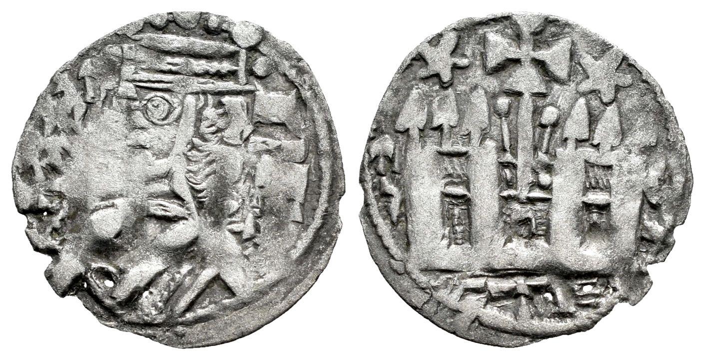 Reino de Castilla y León. Alfonso VIII (1158-1214). Dinero. (Bautista-312 var.). Ve. 0,60 g. Estrellas sobre el castillo. Punto detrás de la corona. MBC-/MBC+. Est...60,00.