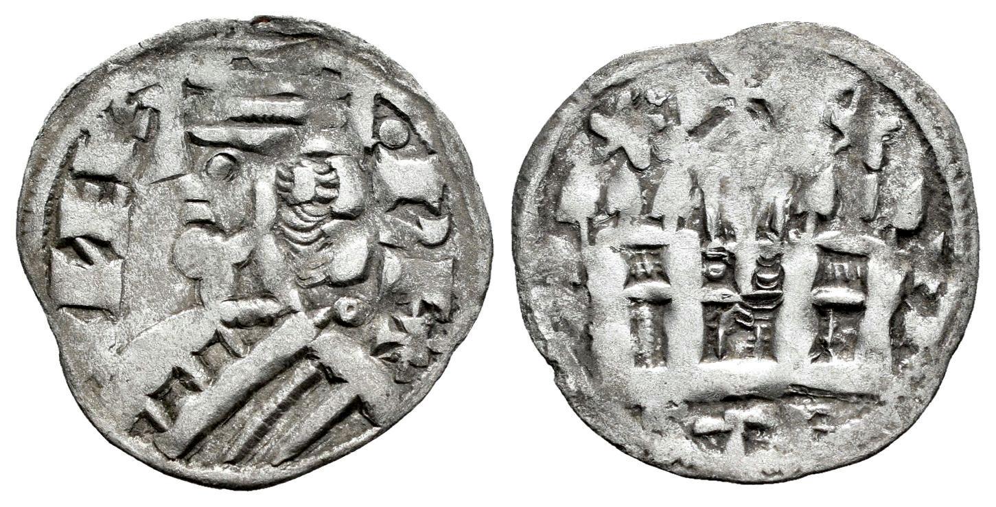 Reino de Castilla y León. Alfonso VIII (1158-1214). Dinero. (Bautista-312.1 var.). Ve. 0,71 g. Estrellas sobre el castillo. Punto detrás de la corona y del busto. Escasa. MBC/MBC-. Est...70,00.