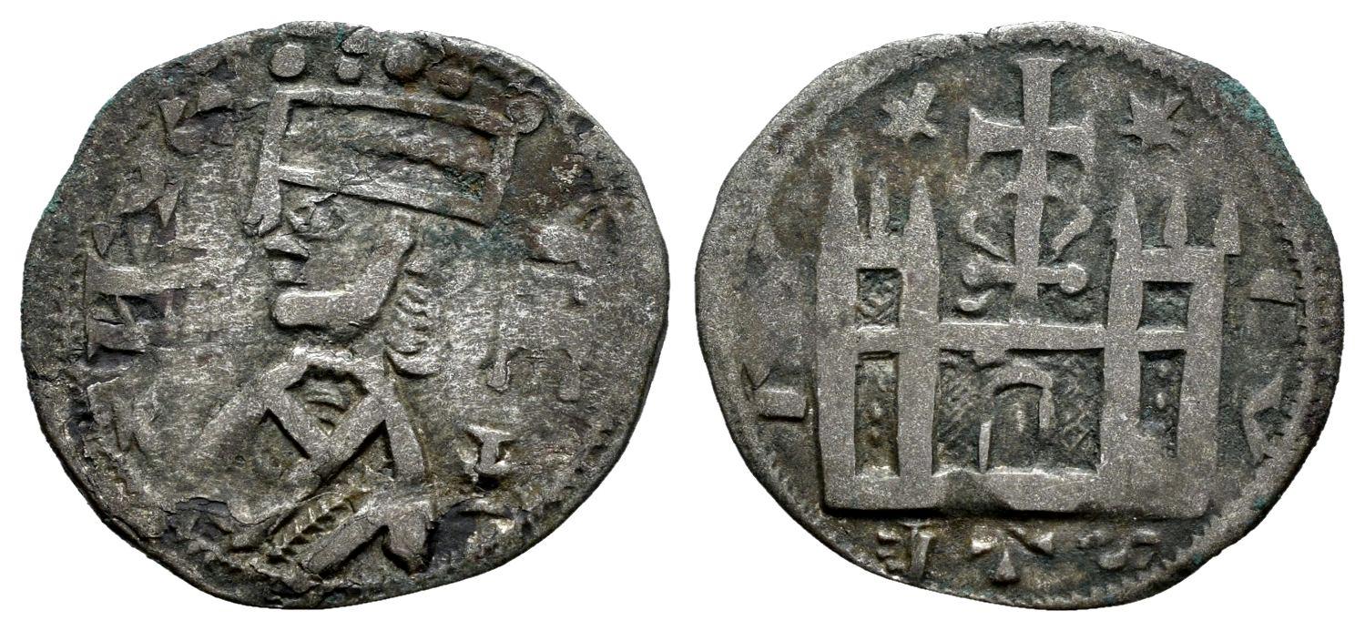 Reino de Castilla y León. Alfonso VIII (1158-1214). Dinero. (Bautista-312.3). Ve. 1,00 g. Estrellas sobre el castillo. Leyenda retrógrada en reverso. Pátina. Rara. MBC. Est...80,00.
