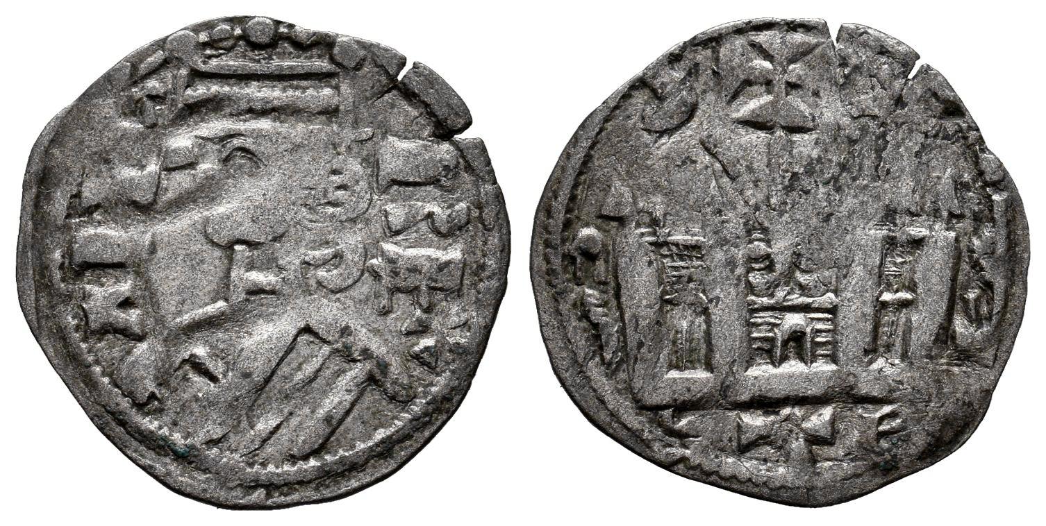 Reino de Castilla y León. Alfonso VIII (1158-1214). Dinero. (Bautista-322). (Abm-204.2). Ve. 0,70 g. Creciente y estrella sobre el castillo. MBC. Est...60,00.