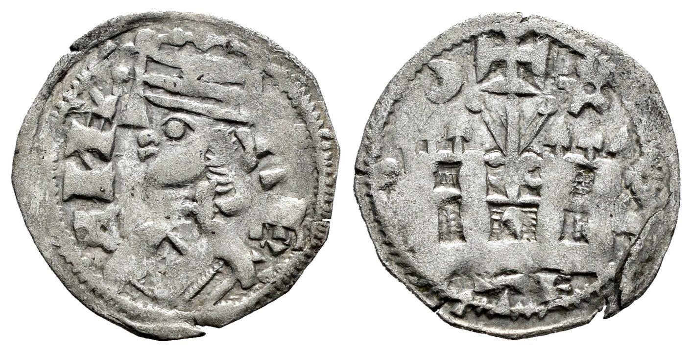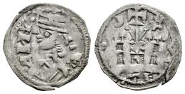 Reino de Castilla y León. Alfonso VIII (1158-1214). Dinero. (Bautista-322). Ve. 0,81 g. Creciente y estrella sobre el castillo. MBC. Est...50,00.