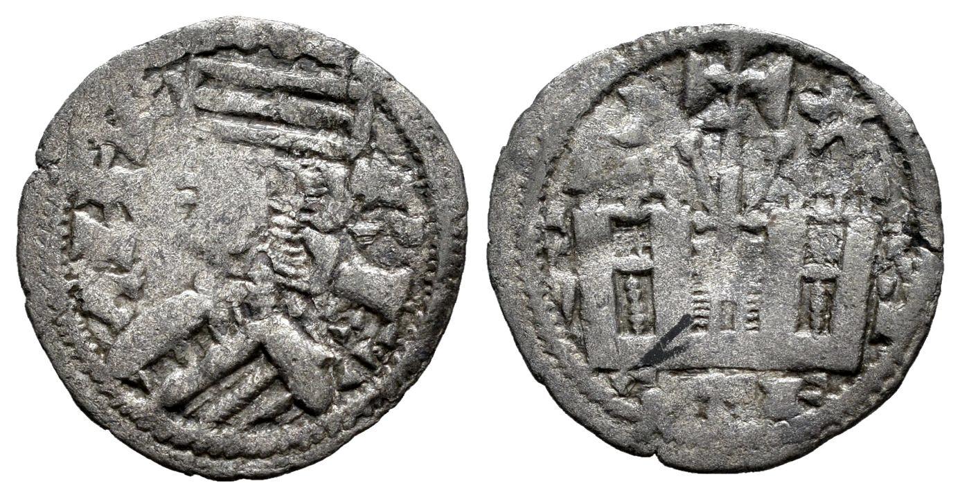 Reino de Castilla y León. Alfonso VIII (1158-1214). Dinero. (Bautista-322). Ve. 0,87 g. Creciente y estrella sobre el castillo. Manchita de tinta. MBC-. Est...50,00.