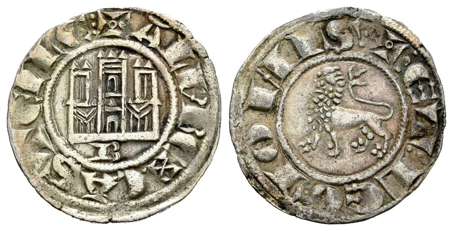 Reino de Castilla y León. Alfonso X (1252-1284). Dinero. Burgos. (Bautista-346). Anv.: + ALF REX . CASTELLE︙. Rev.: +︙ET︙LEGIONIS︙. Ve. 1,04 g. B bajo el castillo. Las cruces del inicio de la leyenda tienen un roel en el centro. Rara. EBC-. Est...100,00.