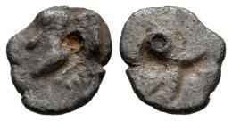 Emporiton-Emporion. Óbolo. 450-425 a.C. Ampurias (Girona). (Abh-No cita). (MIB-1/061). (Acip-2). Anv.: Prótomo de toro androcéfalo a la izquierda. Rev.: Cuadrado incuso. Ag. 0,79 g. Pátina. Perforación. Muy rara. MBC-. Est...100,00.