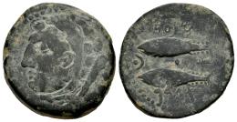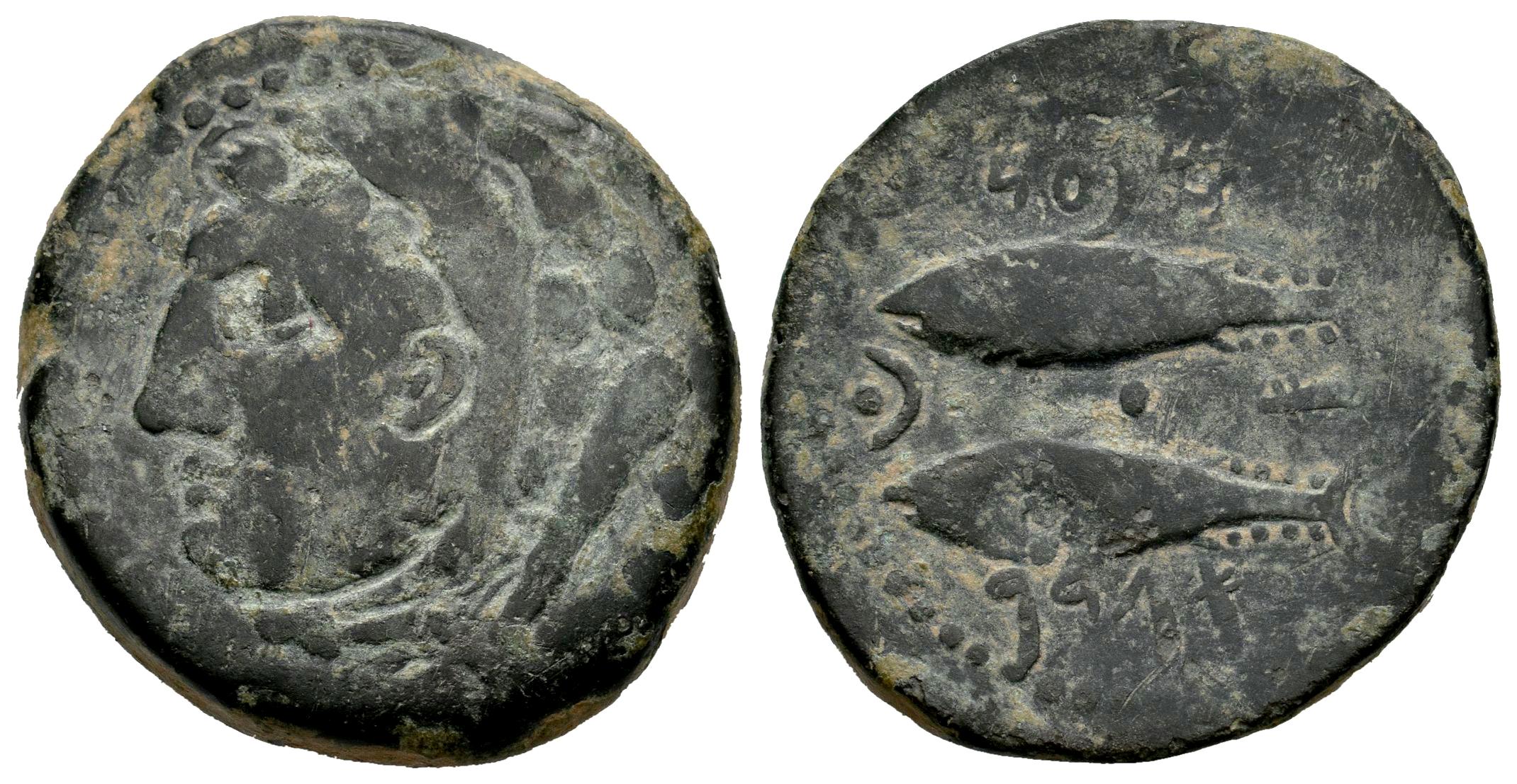 Gades-Gadir. As. 100-20 a.C. Cádiz. (Abh-1340). (MIB-9/60b). Anv.: Cabeza de Hércules a izquierda, detrás clava. Rev.: Dos atunes a izquierda arriba y abajo, leyenda púnica, punto entre atunes y letra púnica alef. Ae. 13,49 g. MBC-. Est...60,00.