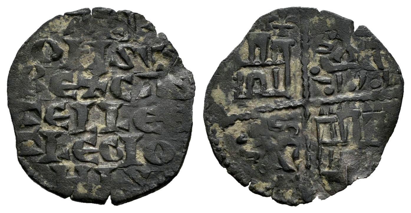 Reino de Castilla y León. Alfonso X (1252-1284). Dinero de seis líneas. (Bautista-364.1). Ve. 0,91 g. Flor de lis con base en el 1º cuadrante. Escasa. MBC. Est...50,00.