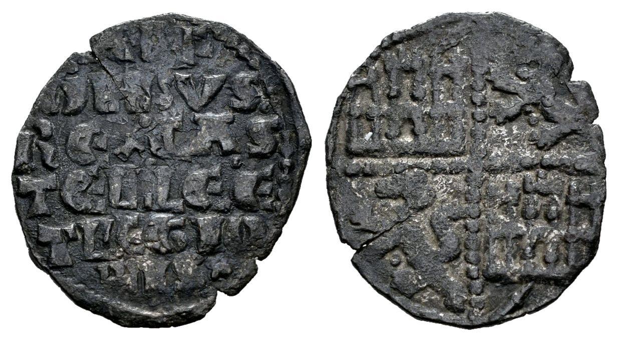 Reino de Castilla y León. Alfonso X (1252-1284). Dinero de seis líneas. (Bautista-367 var.). Ve. 0,69 g. Espada en el 1º y 4º cuartel. Puntos entre las patas de ambos leones. MBC. Est...50,00.