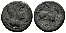 Iltirta. As. 200-20 a.C. Lleida (Cataluña). (Abh-1465). (MIB-67/78b). (Acip-1264). Anv.: Cabeza masculina a derecha rodeada de tres delfines. Rev.: Jinete a derecha con palma y clámide, debajo leyenda ibérica ILTIRTA. Ae. 13,22 g. MBC. Est...100,00.