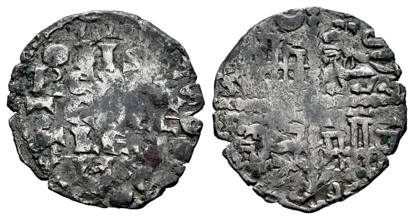 Reino de Castilla y León. Alfonso X (1252-1284). Dinero de seis líneas. (Bautista-368 var.). Ve. 0,91 g. Creciente en el 1º cuartel. Se aprecia una estrella en el 2º cuartel junto a la oreja del león, esta levemente resaltada lo que nos da que pensar que fuese un cuño reutilizado y la creciente más grande de lo habitual. Vellón rico. Muy rara. BC/BC+. Est...200,00.