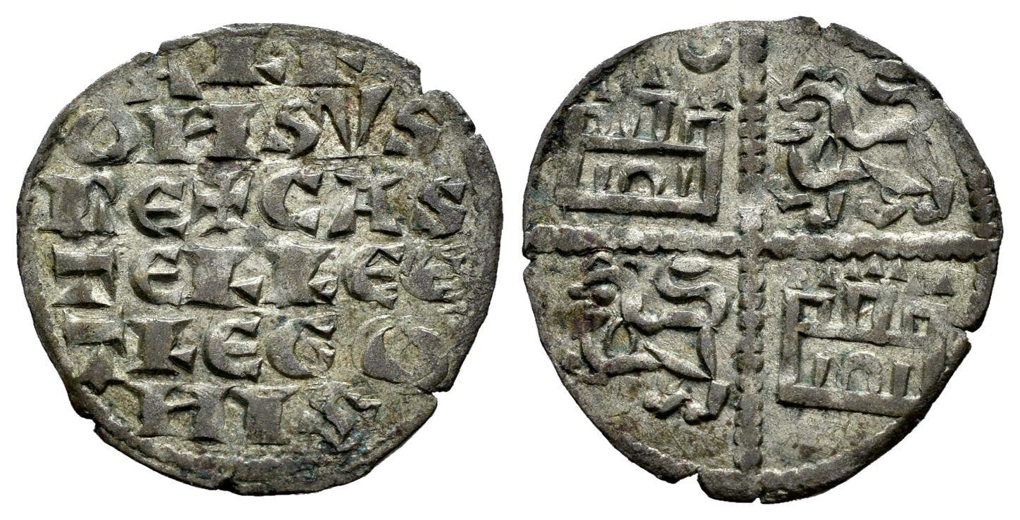 Reino de Castilla y León. Alfonso X (1252-1284). Dinero de seis líneas. (Bautista-368 var.). Ve. 0,96 g. Creciente en el 1º cuartel. Leyenda LEGONIS. Vellón rico. Rara. EBC-. Est...200,00.